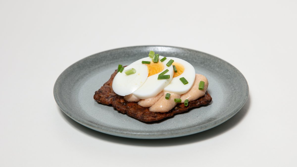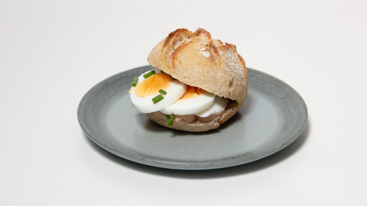 Fröknäcke fritt från gluten med kokt ägg, kalles kaviar och gräslök.