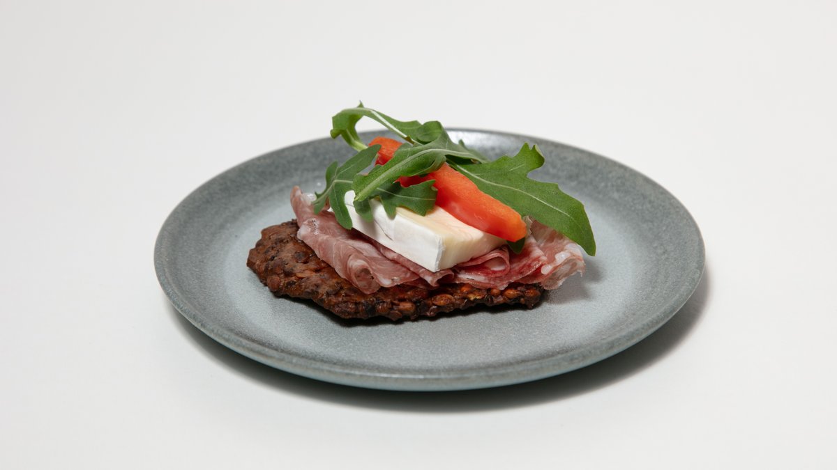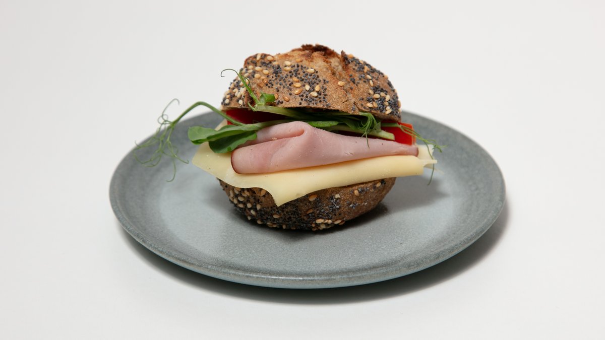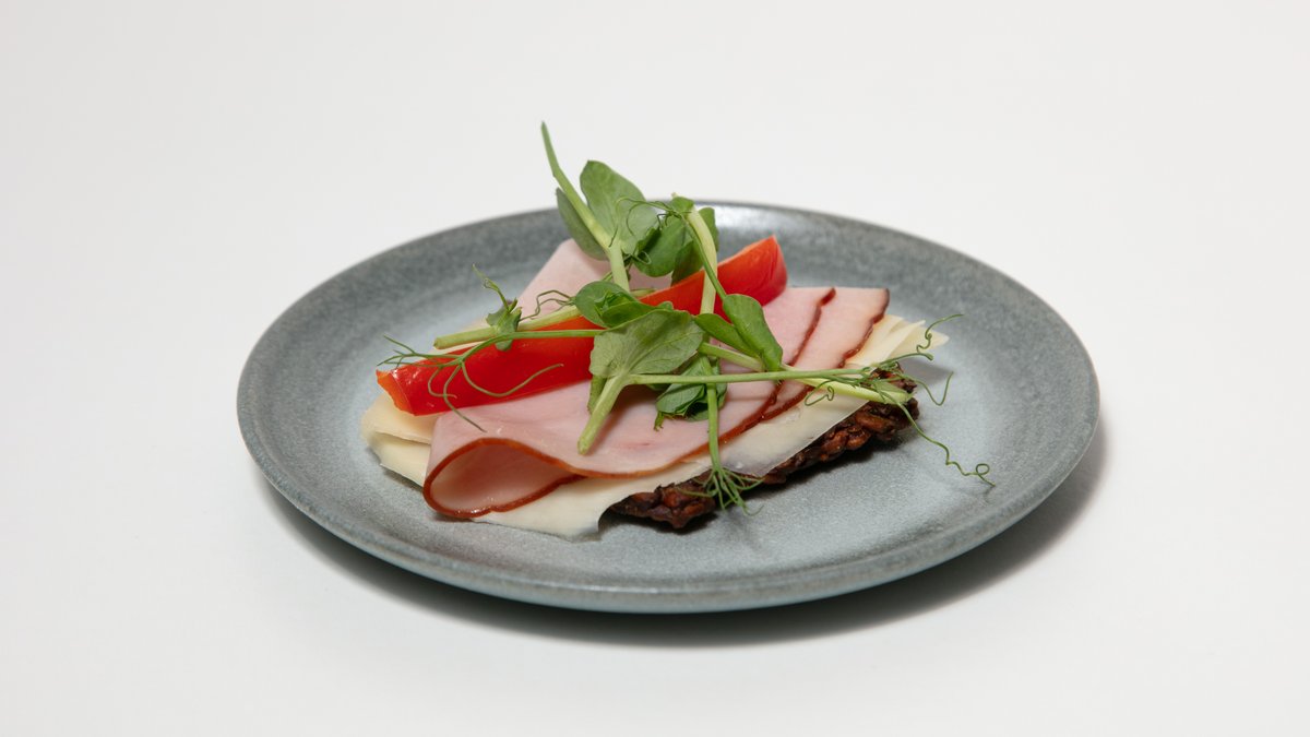 Fröknäcke fritt från gluten med rökt skinka, grevé och paprika.