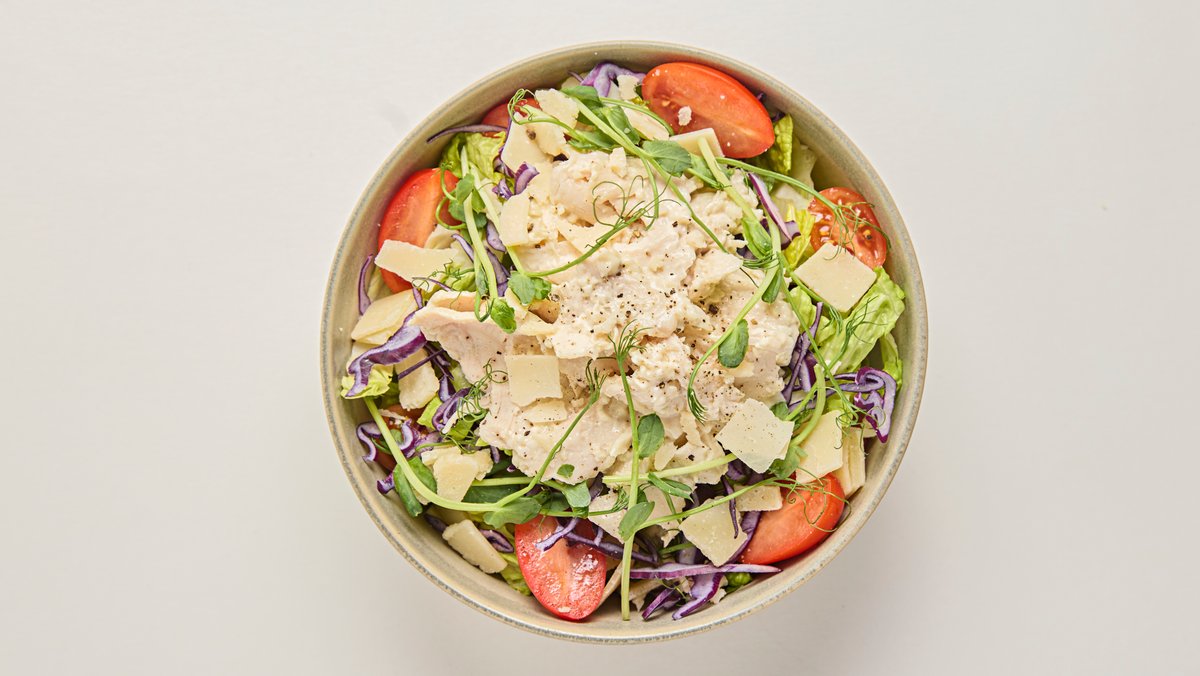 Paninis version på den klassiska caesarsalladen. Kyckling dressad med jordärtskocksdressing och parmesan ger smak till romansalladen som görs krispigare genom att lägga till rödkål. Toppas med cocktailtomater och ärtskott.