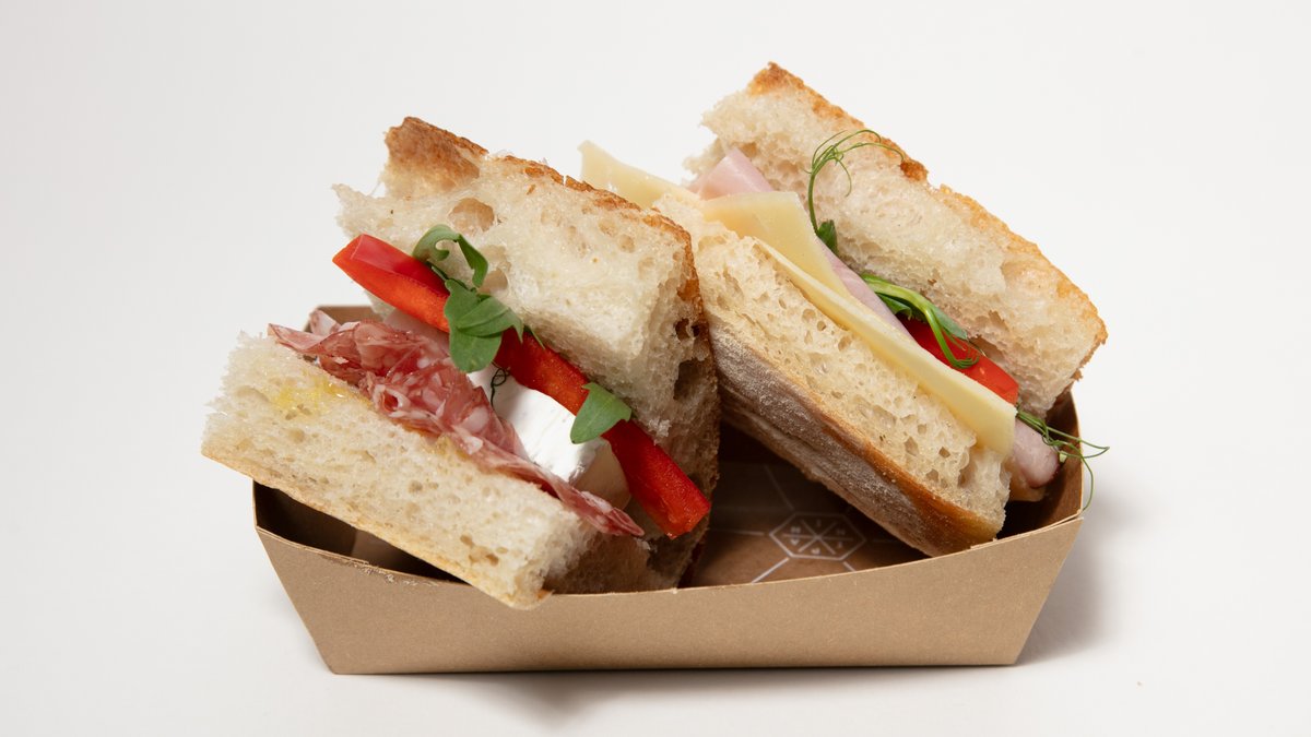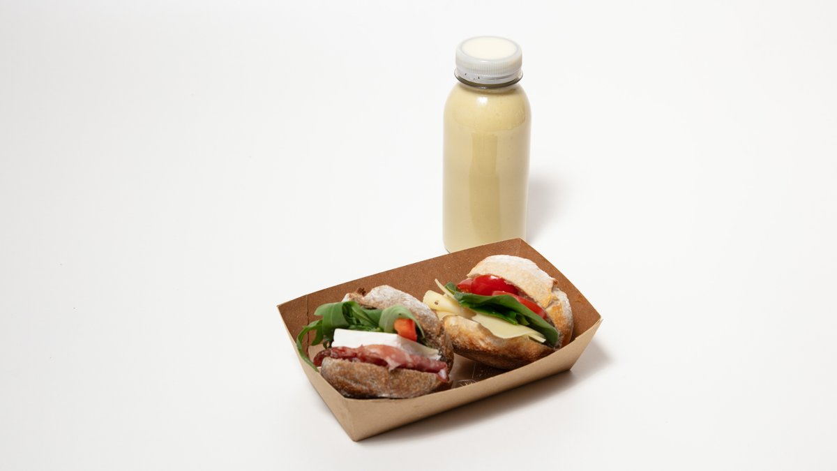 I detta frukostpaket har vi kombinerat två mindre mackor av stenugnsbakat surdegsbröd med olika pålägg. Till kommer en flaska Råsaft.