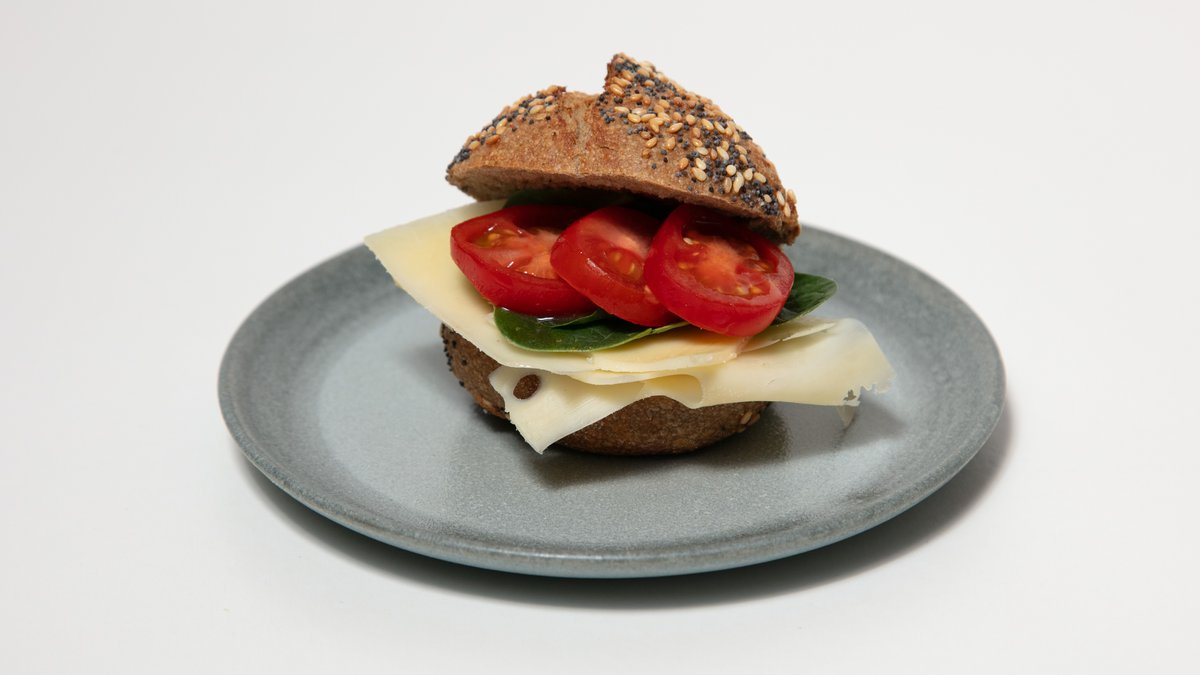 Fröknäcke fritt från gluten med grevé, tomat och spenat.