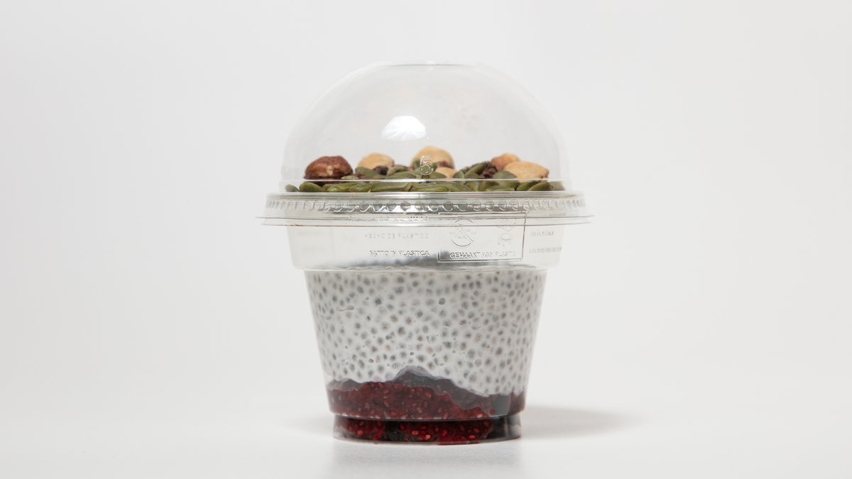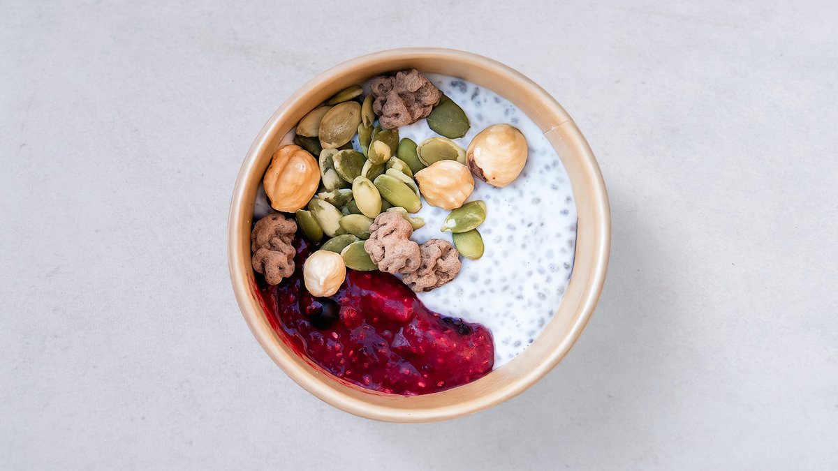 För att få till en chiapudding som verkligen är god, kombinerar vi två olika sorter. I den ena lägger vi chiafröna i jordgubbar och blåbär. I den andra blötlägger vi dem med kokosgrädde och mandelmjölk. Serveras med en topping av rostade hasselnötter, pumpafrön och råchokladdoppade mullbär.
