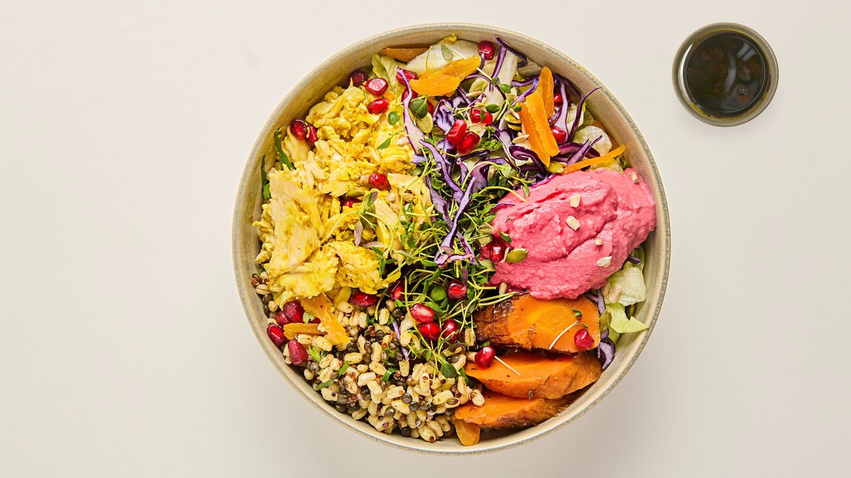 Kumminmarinerad kyckling, rödbetshummus, dinkel, quinoa, linser, rostade rotfrukter, granatäpple, torkad aprikos, pumpafrön, solrosfrön, rödkål, sallad och timjan.