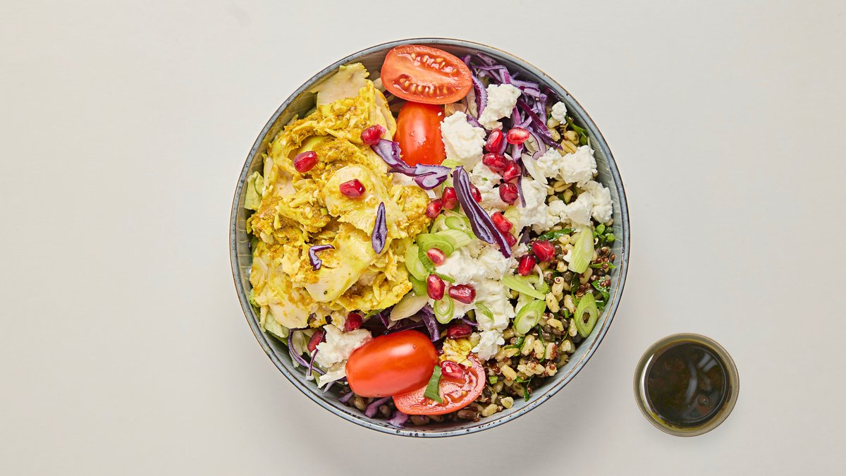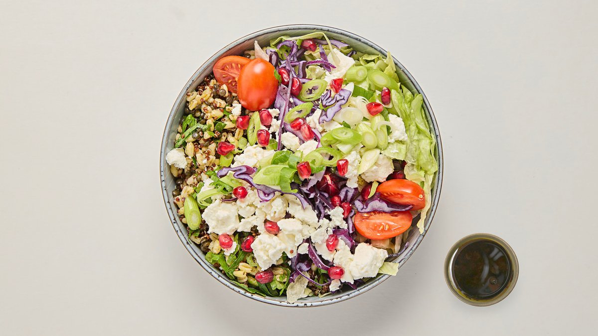 Bas av dinkel, quinoa och linser. Topping av fetaost, granatäpple, persilja, kvisttomat, vårlök, rödkål och sallad.