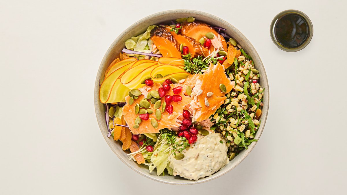 Sallad gjord på Paninis DQL-bas som innehåller marinerad dinkel, quinoa och linser. Varmrökt regnbågslax balanseras med syrlig senapskräm med kålrabbi. Salladen innehåller även rödkål, picklad gulbeta, sallad, granatäpple, pumpafrön och krasse.