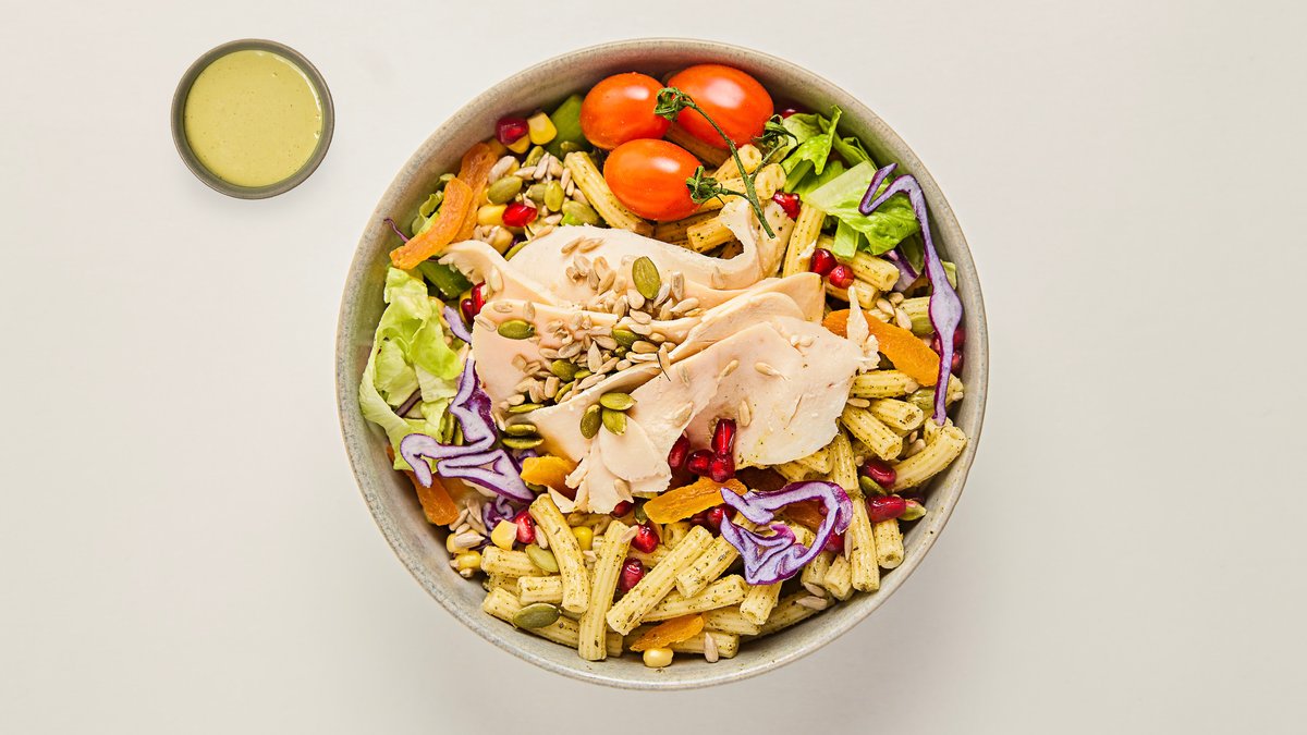 Favorit pastasalladen från Panini. Kommer som vanligt med majs, cocktailtomater, rödkål, gurka, granatäpple, solros- och pumpafrön och torkad aprikos.