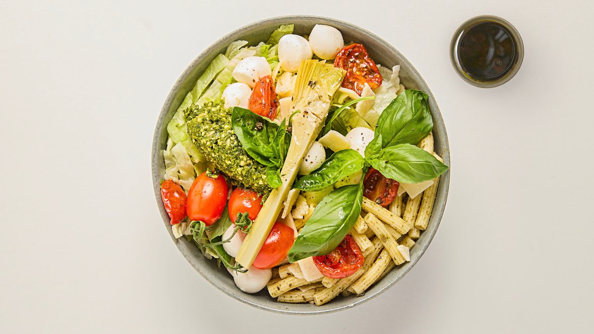 Pastasallad med färsk mozzarella och Parmigianno- Reggiano. Färsk och semitorkad tomat, parmesan, basilika, kronärtskocka och pesto på solros- och pinjefrön.