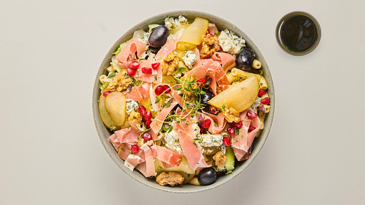 Lyxig pastasallad med mycket smak. Ädelost och proscuitto får sällskap av inlagt päron, salladsmix, kanderade valnötter, gurka, vindruvor, granatäpple och timjan.