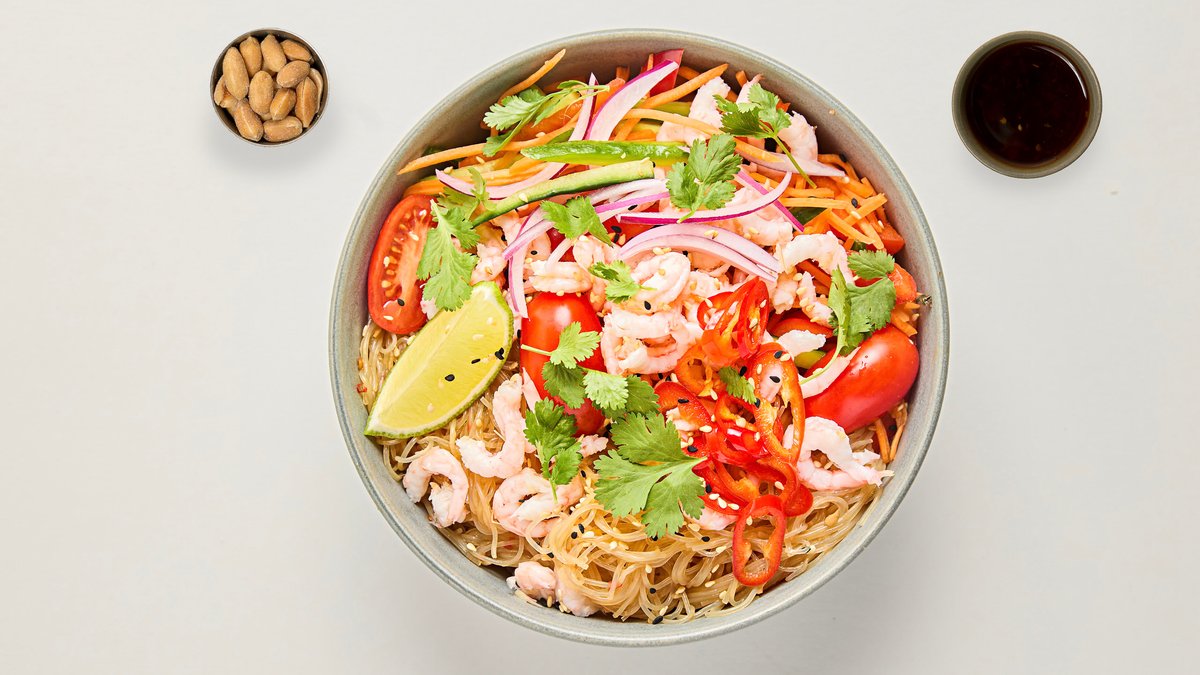 Kall bowl med smaker från det thailändska köket. Nudlar gjorda på mungbönor marinderade i Paninis thai-dressing med krispig gurka, paprika och rödlök. Här finns även chili, lime, sesamfrön, salladslök och koriander.