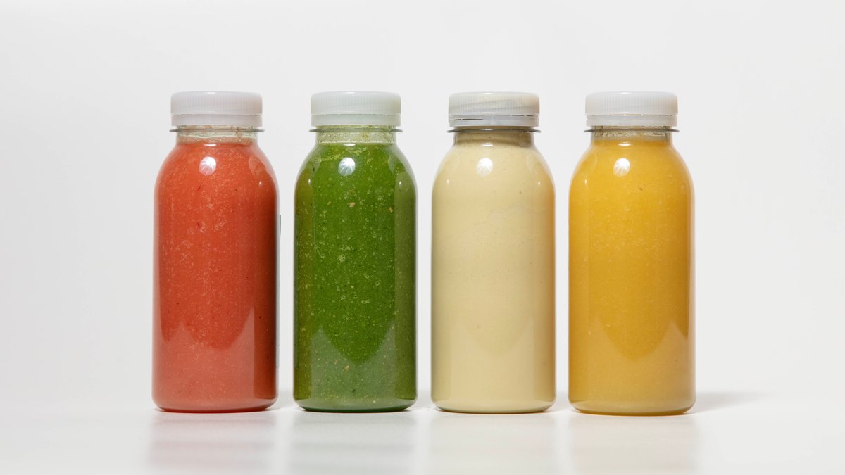 Den gröna flaskan har en frisk smak från äppelmust, avokado, spenat och ingefära. Vi gör våra smoothies på plats i butik och använder inga mjölkprodukter.