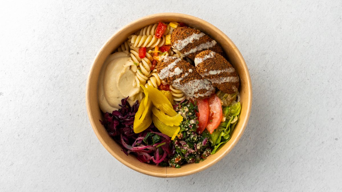 Vegansk. Vår egen, krispiga falafel gjord från grunden, serveras på ris med krispig sallad, len hummus, inlagda grönsaker, jalapeño, tahinisås och en frisk touch av sumak – en smakexplosion i varje tugga!