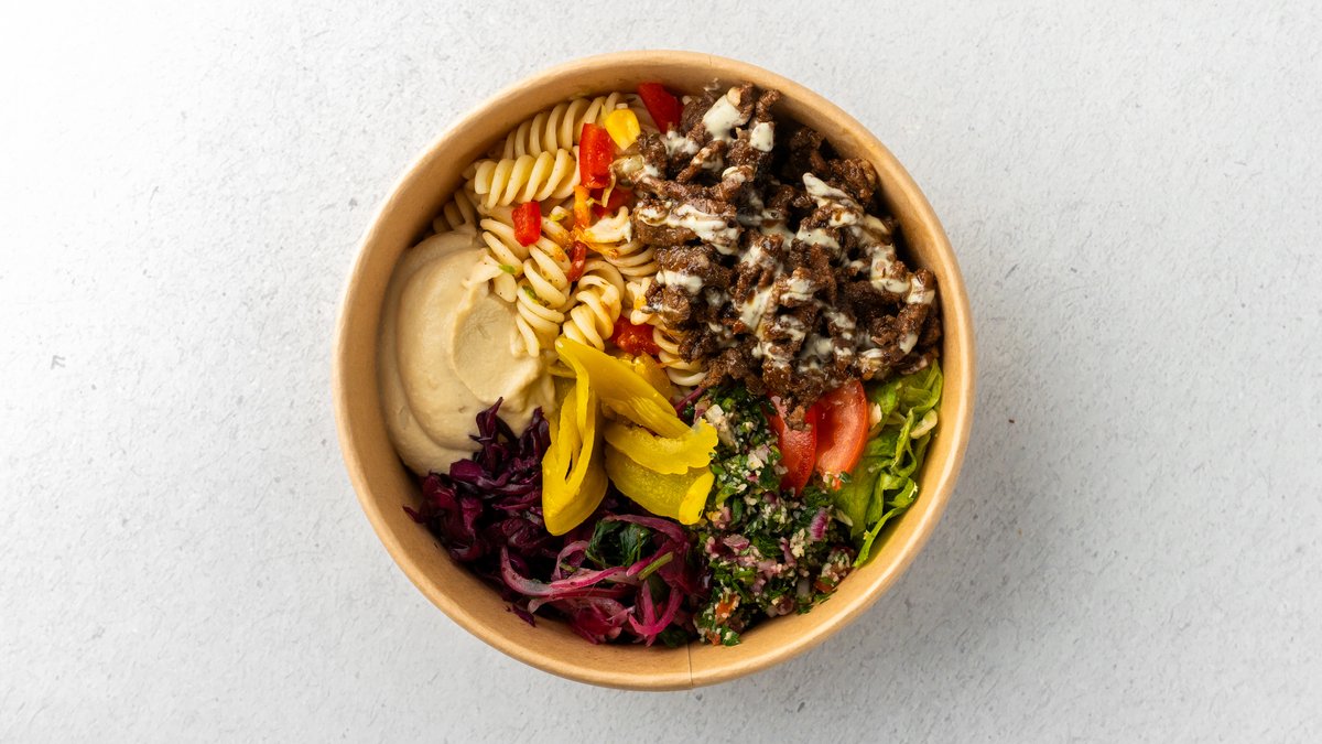Saftigt kryddat nötkött på ris med krispig sallad, len hummus, inlagda grönsaker, jalapeño och tahinisås med granatäppelsås – en smakexplosion i varje tugga!