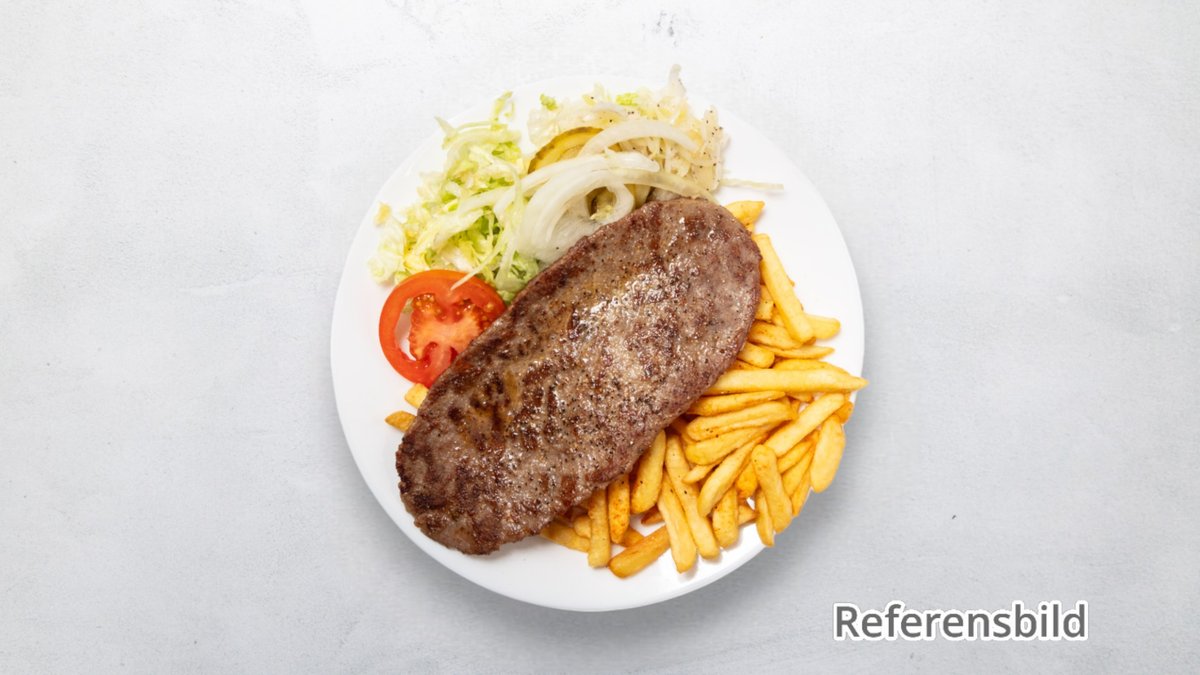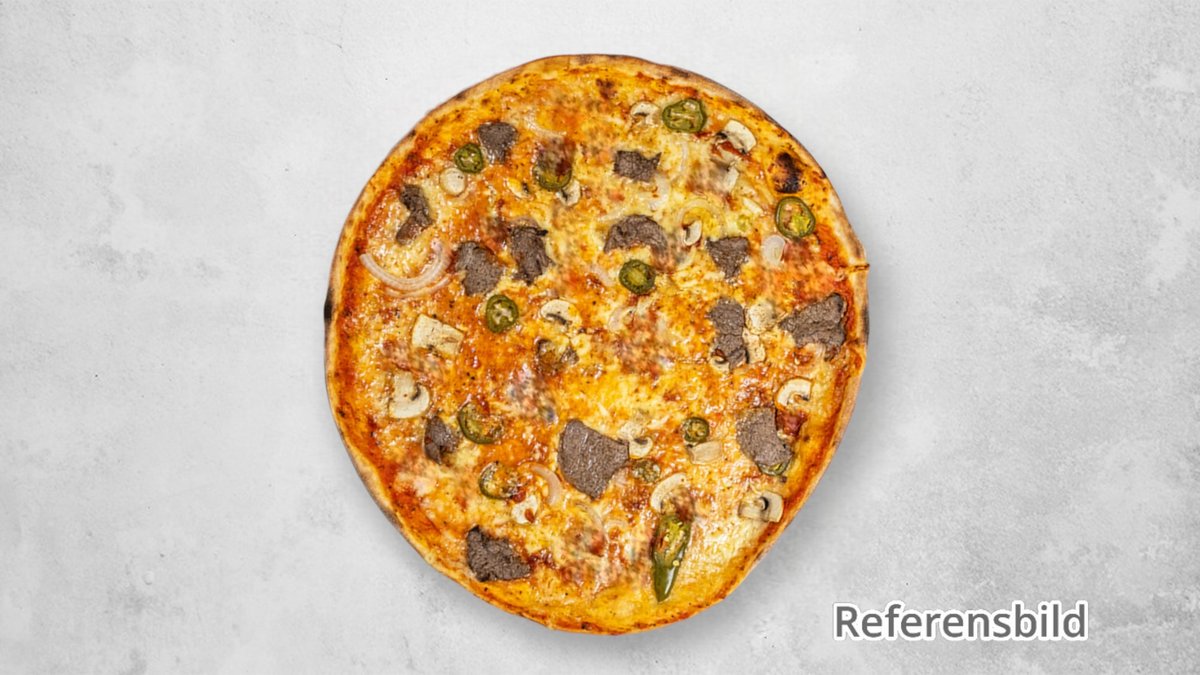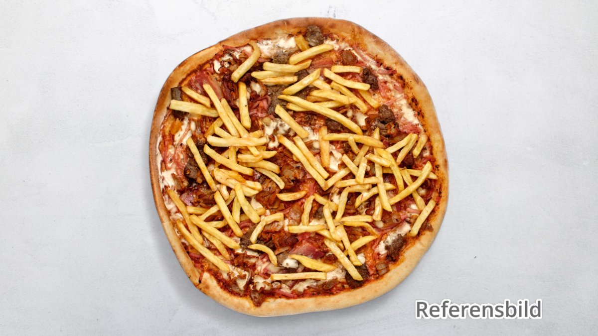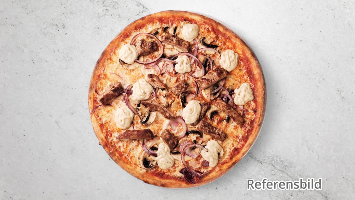 Tomatsås, ost, lök, tomater, feferoni, kebabkött, vitlökssås och stark kebabsås.