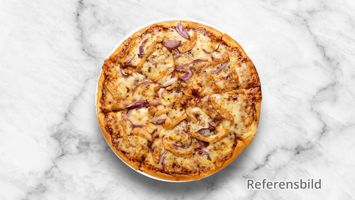 Tomatsås, ost, kycklingkebabkött, lök, feferoni, tomater, vitlökssås och starksås.