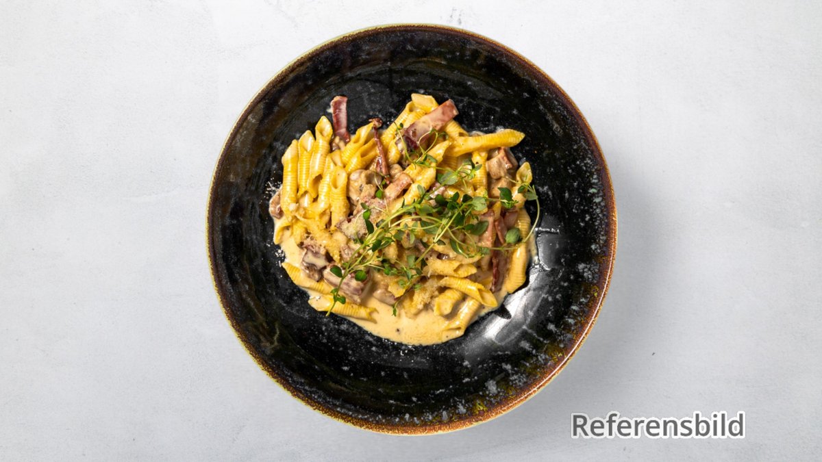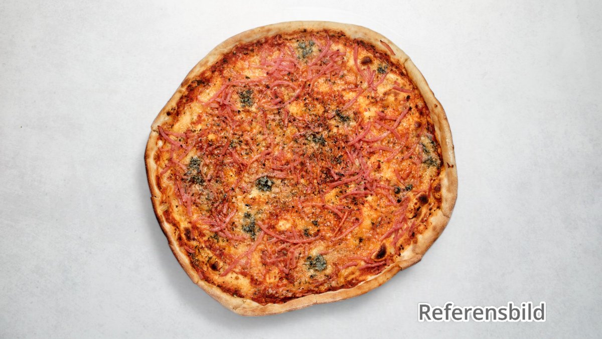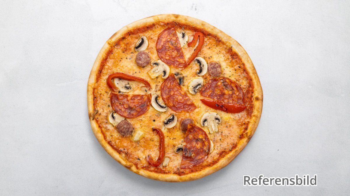 Tomatsås, ost, skinka, champinjoner, lök, tomater, paprika och räkor.