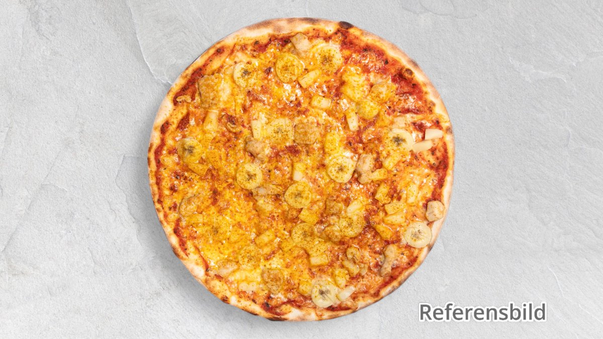 Tomatsås, ost, skinka, ananas, banan, curry och jordnötter.