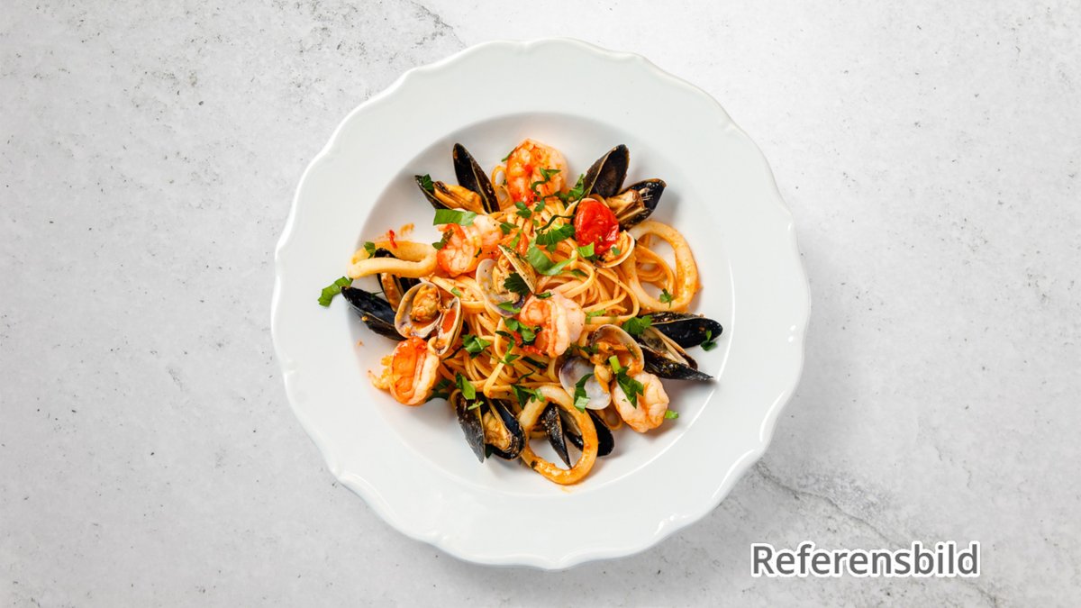 Tomatsås, ost, champinjoner, skinka, räkor, musslor, oliver och kronärtskocka.