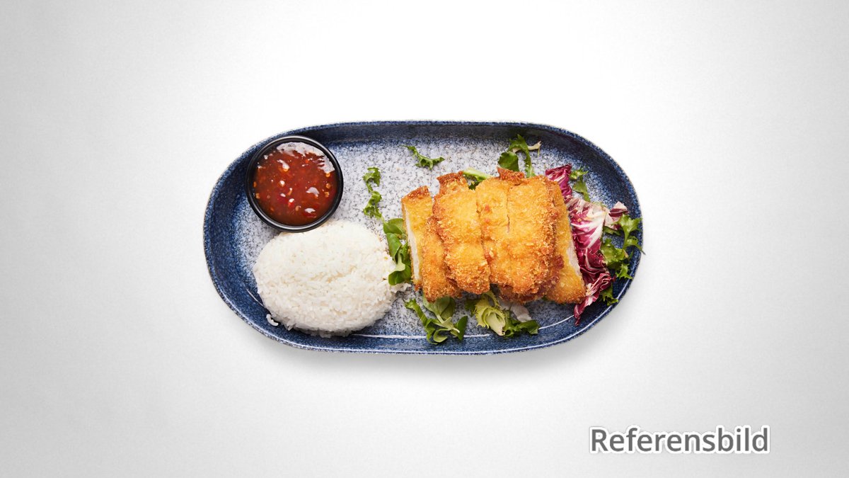 panko friterad kyckling med ris och sötsur sås.