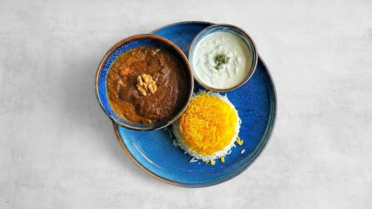 Fesenjon är en sötsur gryta som innehåller valnötter och granatäppelsirap, bland annat de mäst populära persiska rätter. Serveras med persisk tsatsiki och toppas med saffranris.