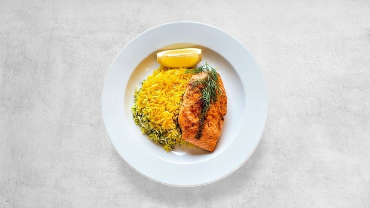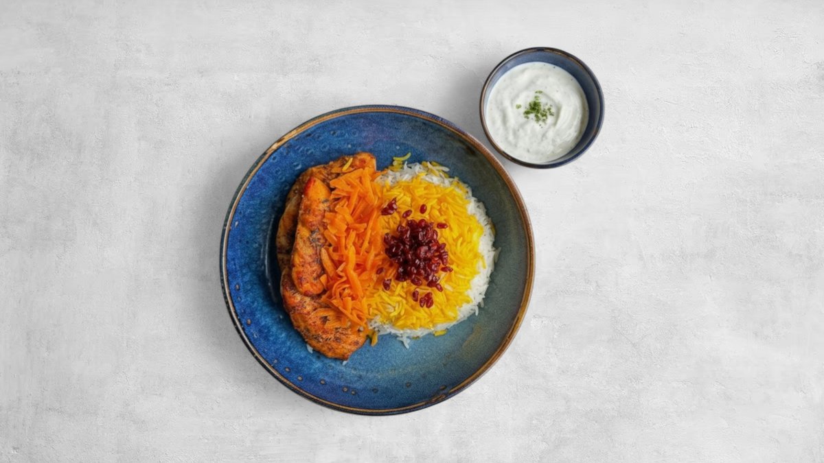Saffron rice mixed with yogurt and egg, lightly seasoned with citron pepper and paprika, layered with grilled chicken fillet, tomato sauce, and barberries, baked until golden, served with tsatsiki on the side.