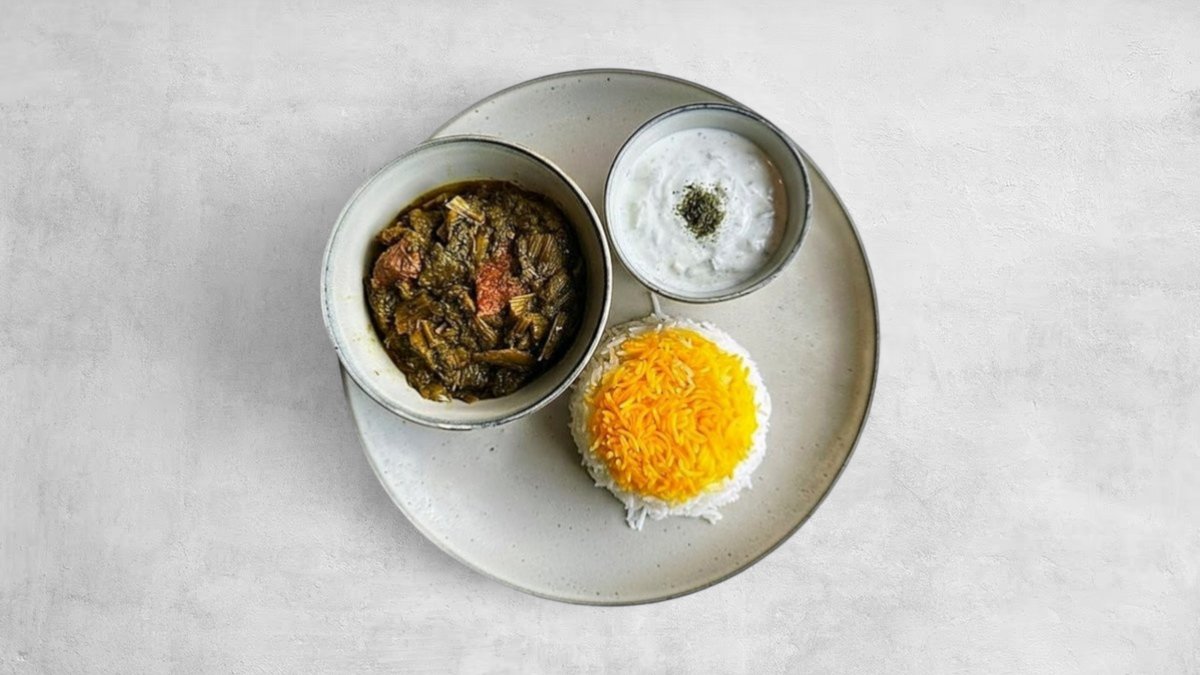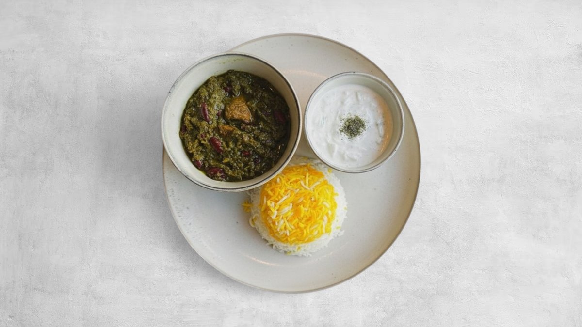 Khoresh Aloo Esfenaj Är en mycket smakrik spenat och gyllene plommongryta med stekt kalvkött eller högrev. Serveras med tsatsiki och toppas med saffranris.