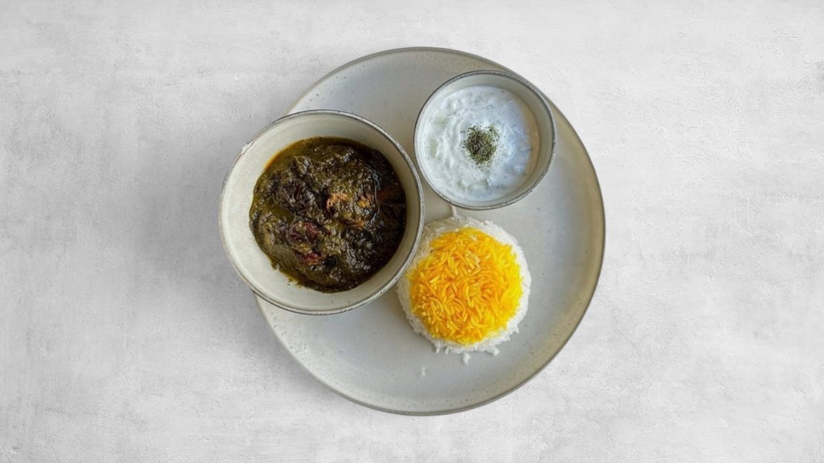 Persisk kött and örtgryta ( ghormeh sabzi ) En utsökt och nyttig persisk gryta med kalvkött eller högrev, örter och En Klassik och välkänd gryta i Iran som serveras med persisk tsatsiki och toppas med saffransris.