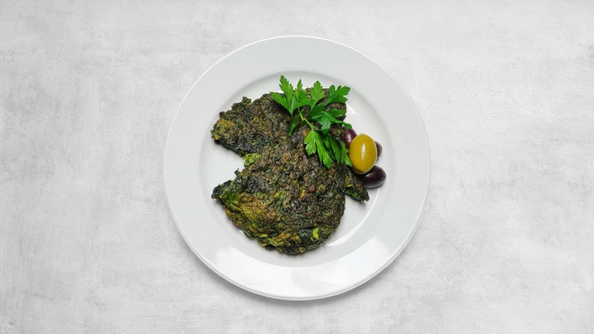 Koko sabzi är en persisk omelett med örter och gurkmeja. Serveras tillsammans med napolisallad, halkidiki oliver, vitlöksbröd och persisk tzatziki.