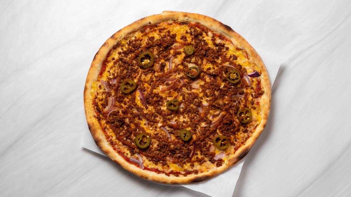 Tomatsås, ost, majs, rödlök, paprika, oliver, jalapeños, tacoså och taco kryddmix.