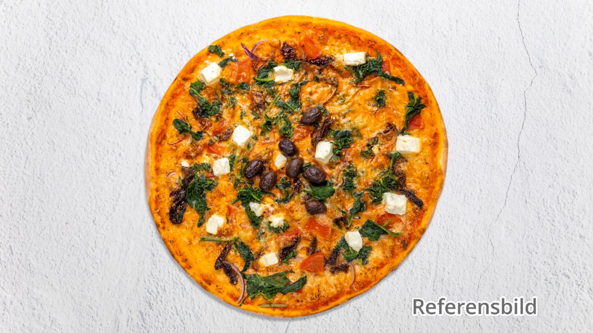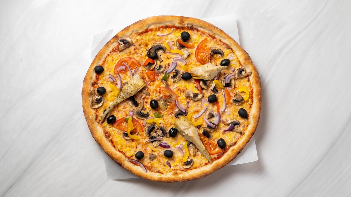 Vitlök, tomater, kronärtskocka, oliver, paprika, rödlök, champinjoner, tomatsås och vegansk ost.