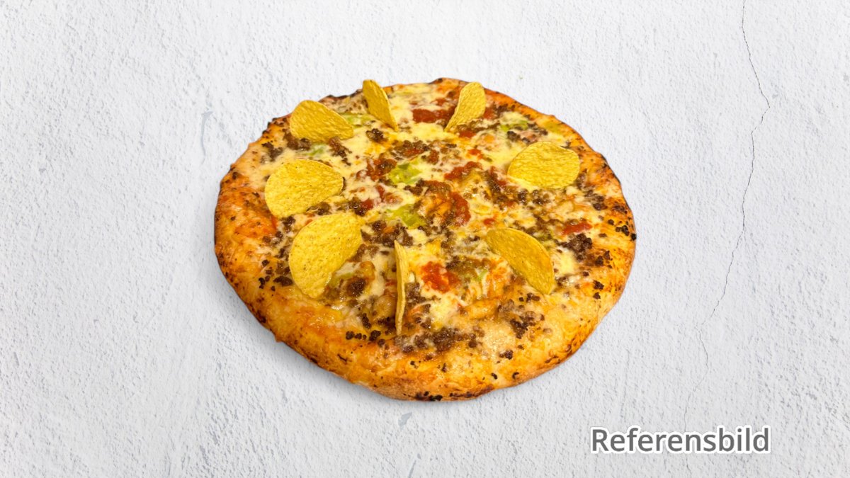 Tomatsås, ost, skinka och nötfärs.