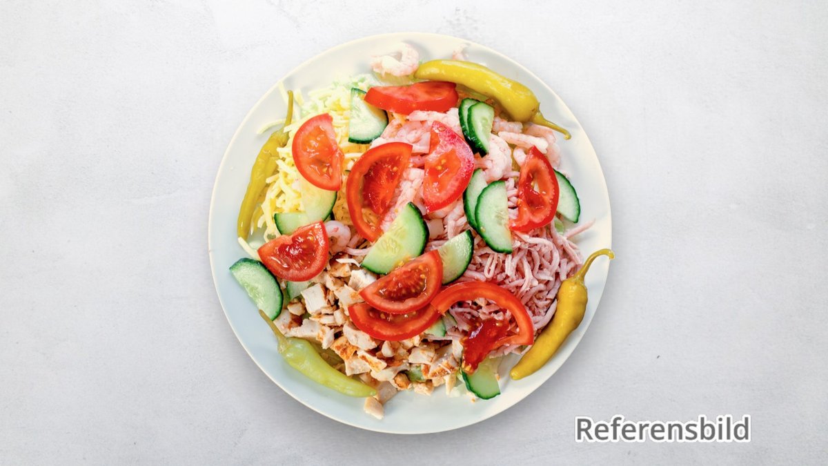 Ost, tonfisk, isbergssallad, tomater, majs, champinjoner, gurka, citron och vitlöksbröd.
