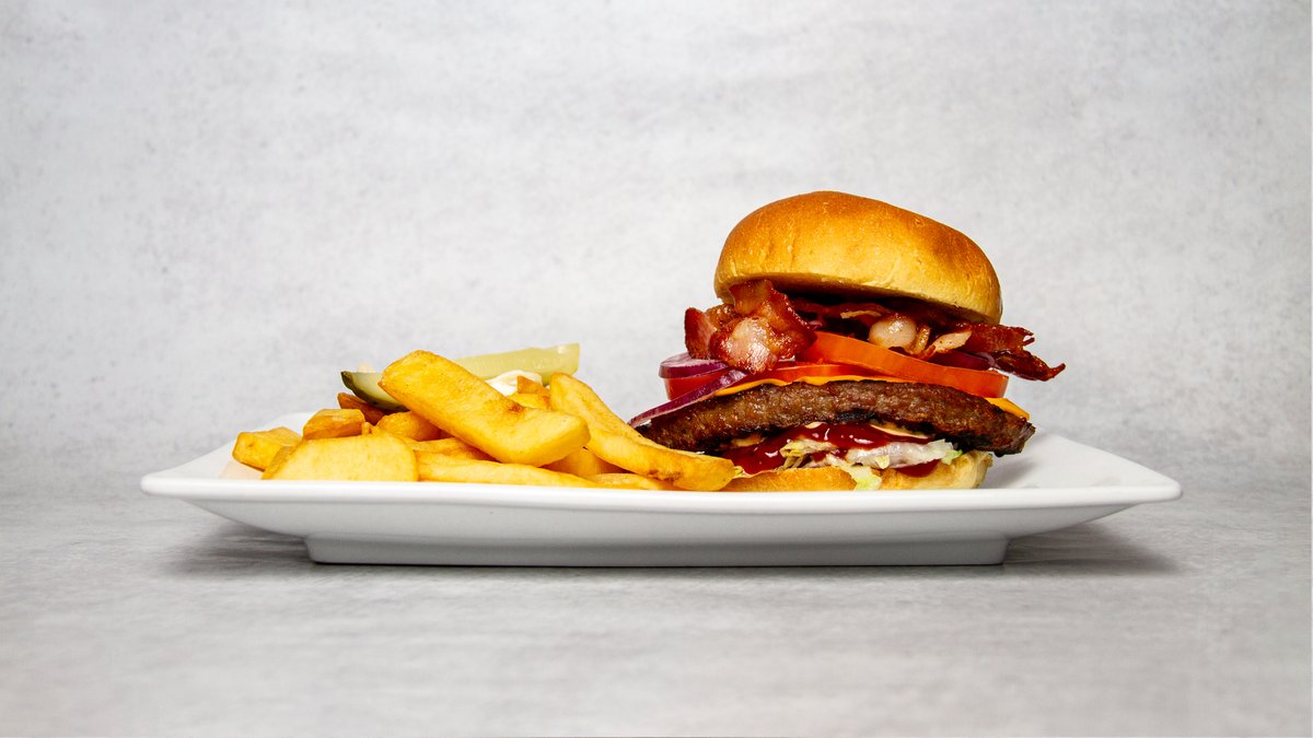 Högrevsburgare (150g) med Ruby's BBQ-sås, bacon, amerikansk cheddarost, sallad, rödlök och färsk tomat. Serveras med Steakhouse fries, coleslaw och saltgurka.