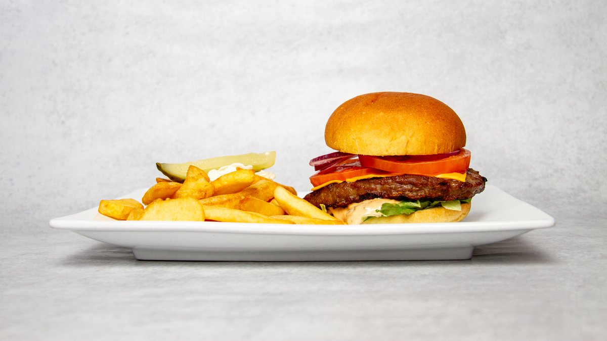 Högrevsburgare (150g) med originaldressing, sallad, amerikansk cheddarost, rödlök och färsk tomat. Serveras med steakhouse fries, coleslaw och saltgurka.