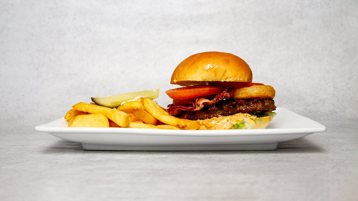 Högrevsburgare (150g) med originaldressing, bacon, amerikansk cheddarost, sallad, rödlök och färsk tomat. Serveras med Steakhouse fries, coleslaw och saltgurka.