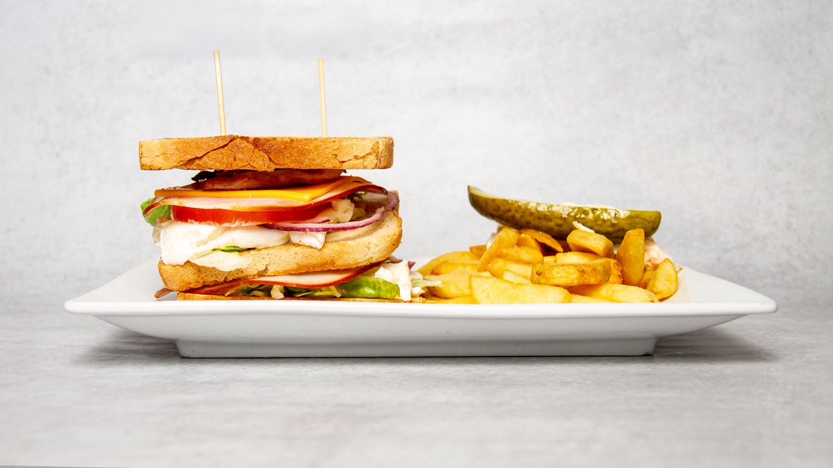 Tre skivor formfranska, sallad, rödlök, färsk tomat, kalkon, bacon, cheddarost & majonnäs. Serveras med steakhouse fries, coleslaw och saltgurka.
