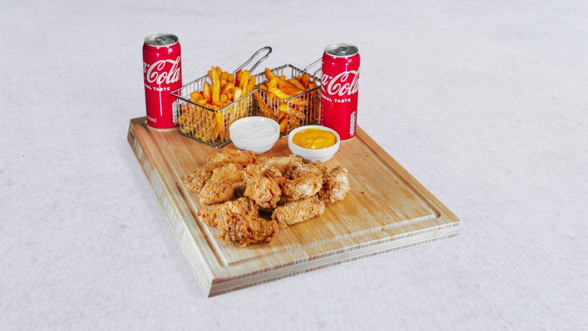 Box för två. Blandning av toronto recipe kycklinglår eller kycklingklubba, 4 st hot wings, 4 st crispy strips och 10 st popcorn chicken, 2 st pommes, 2 st dipsås och 2 st drickor.