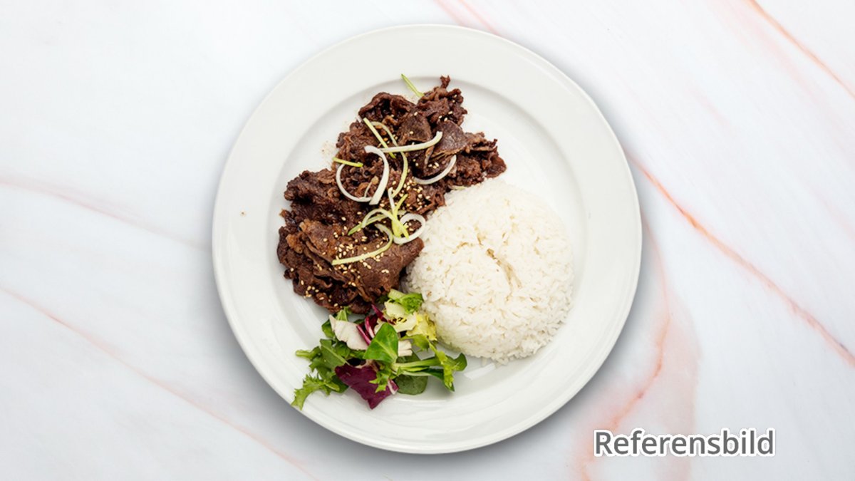 Entrecote, sushiris, isbergssallad, gurka, avokado, mango och yakinikusås.