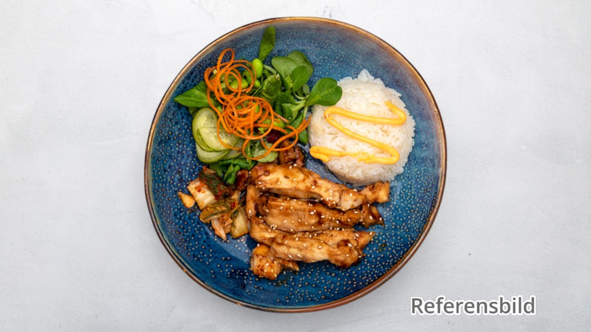 Teriyaki kyckling med sushiris, gurka, isbergssallad, teriyakisås och soja.