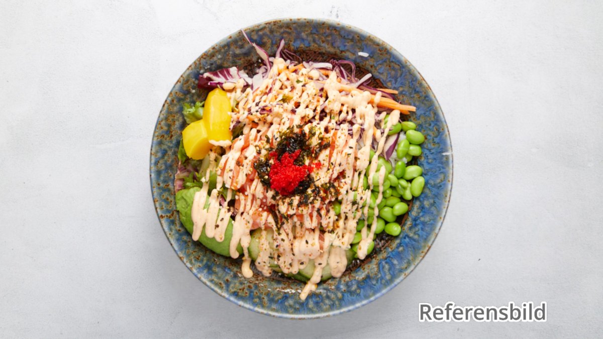 Räkor, sushiris, isbergssallad, gurka, avokado, mango, sojabönor, rostad lök, majonnäs, chilimajonnäs, poke bowl sås och soja.