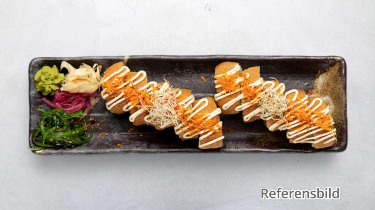 9 tempura maki, 3 avokado, 3 friterade räkor, majonnäs och chilimajonnäs.
