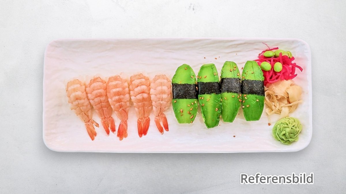 6 räkor, 2 crabstick, 4 avokado, 2 omelett, 2 tofu, 2 mango och 12 maki.