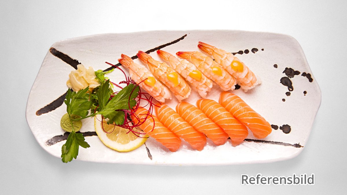 2 lax, 1 tonfisk, 1 räkor, 1 crabstick och 4 maki.