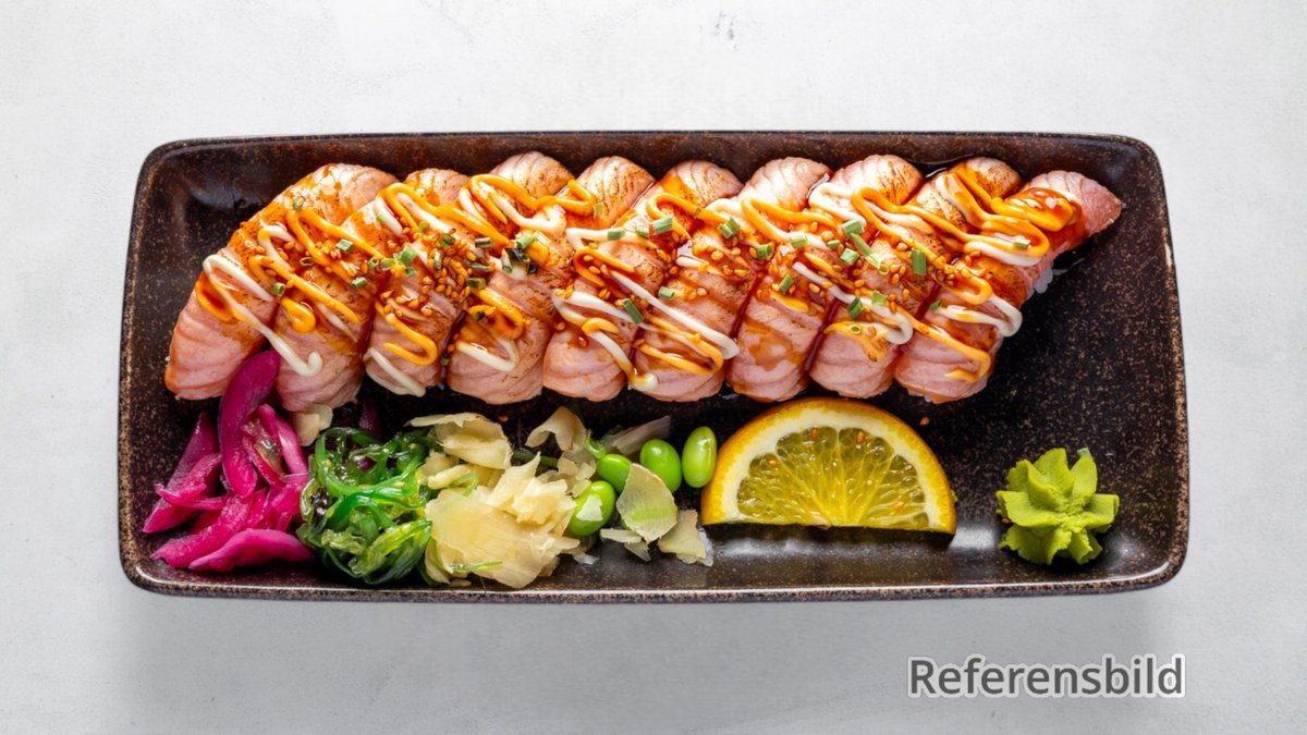 Flamberad lax nigiri, majonnäs, chilimajonnäs och rostad lök.