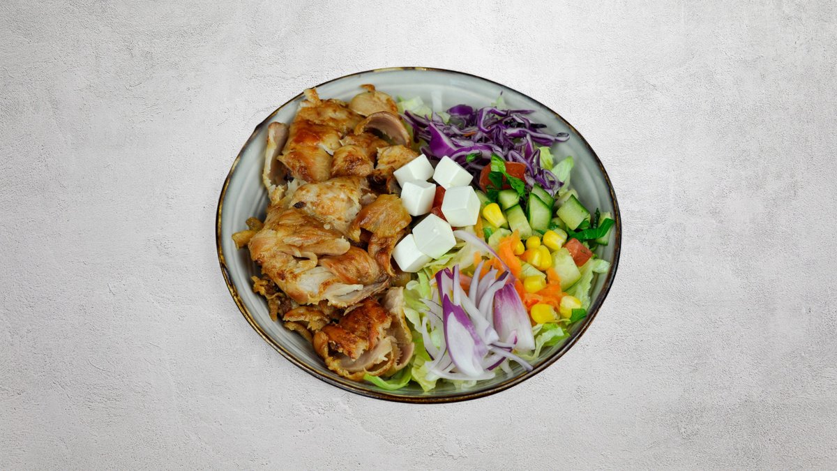 Kyckling, isbergssallad, lök, tomater, kebabsås och gurka.