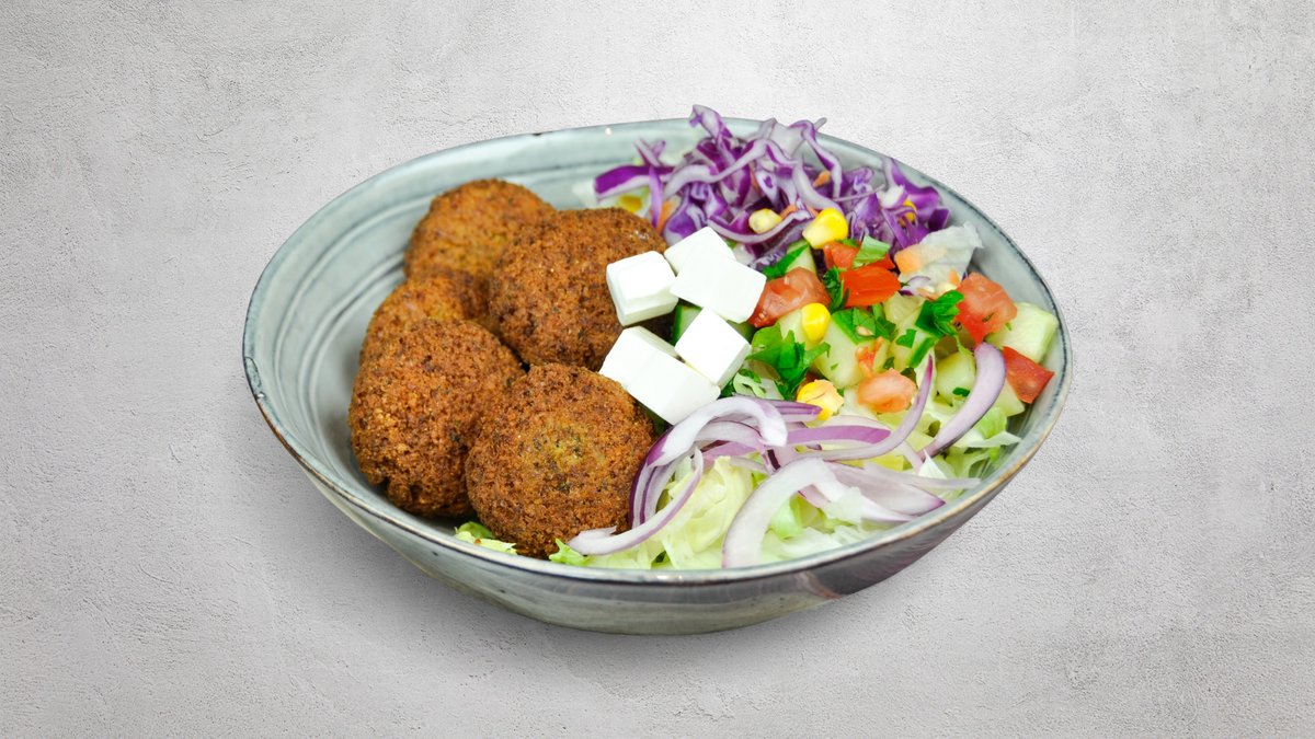 Isbergssallad, morot, majs, bondsallad, rödkål, rödlök, salladsost och dressing.