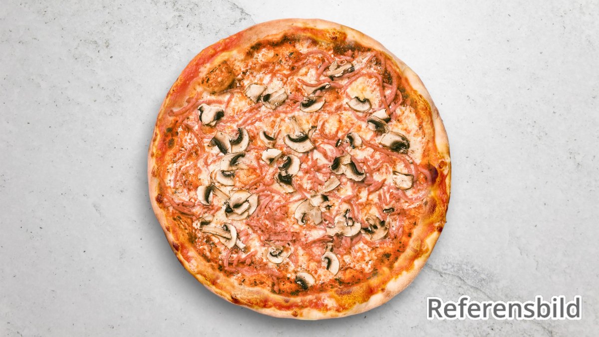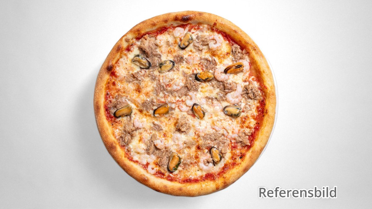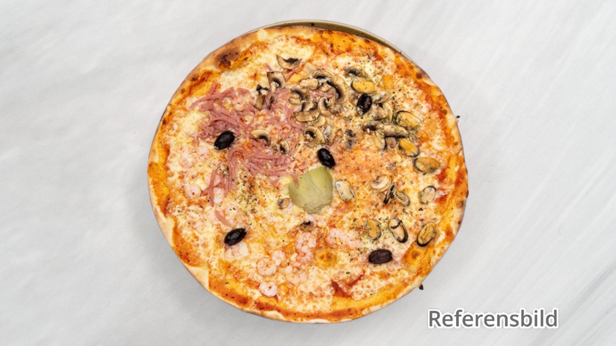 Skinka, räkor, musslor, champinjoner och kronärtskocka.