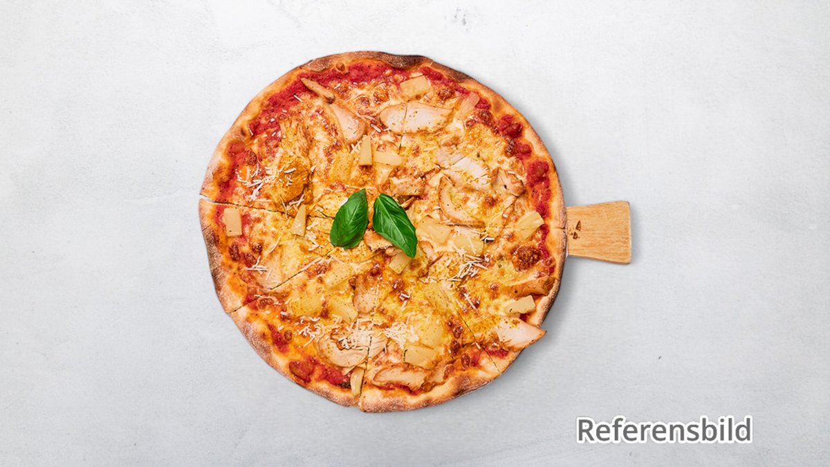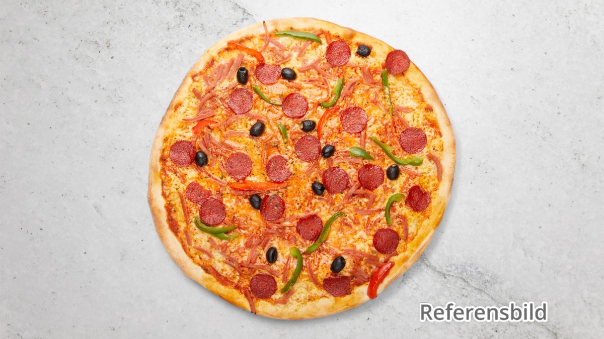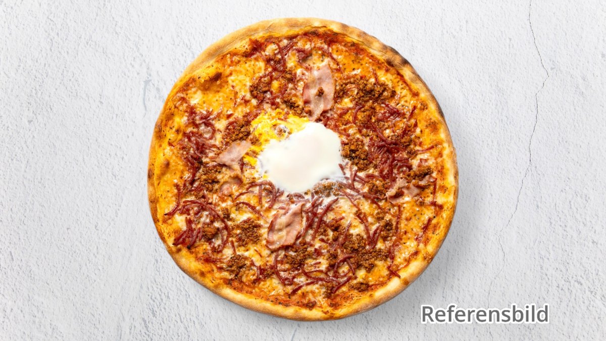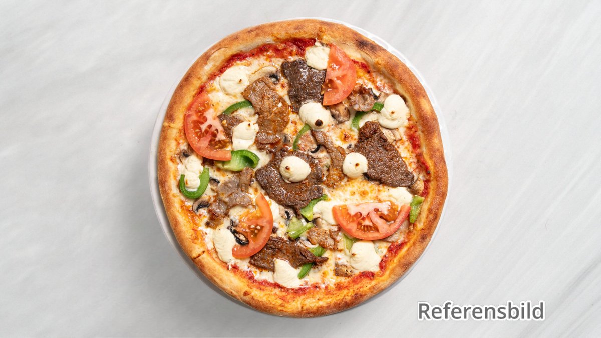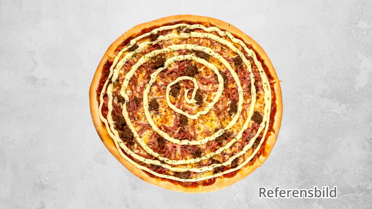 Köttfärs, cayennepeppar, ananas, pepperoni, isbergssallad, lök, tomater, gurka och kebabås.