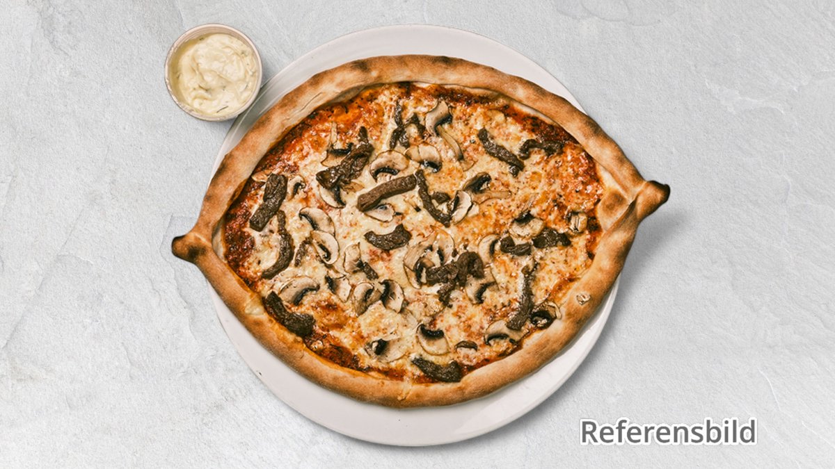 Köttfärs, räkor, lök, paprika, pepperoni och bearnaisesås.