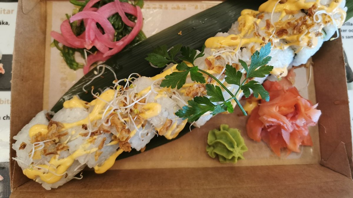 3 Lax, 1 avokado, 1 räka, 1 crabfish, 4 california maki, chilimajonnäs och friterad lök.