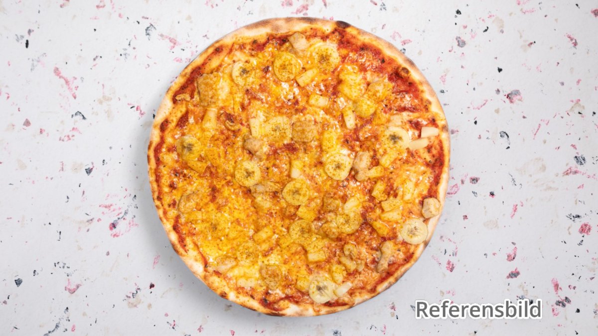Skinka, champinjoner, ananas, banan, fläskfilé och curry.